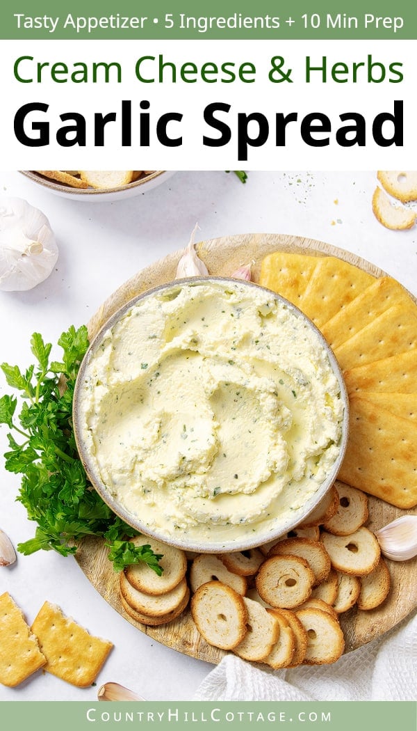 This easy homemade garlic cheese spread is a soft, creamy dip blended with garlic and herbs. It's the perfect cheese appetizer to serve with crostini, crusty bread, crackers, and vegetables. Garlic cream cheese is absolutely irresistible, and you'll want to eat it on repeat.